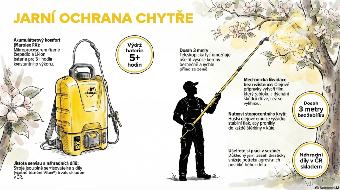 - Přesnost: Díky 3m tyči aplikujete postřik shora přímo na pupeny, kde se škůdci koncentrují nejvíce.