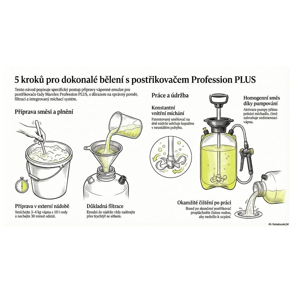 - Malířský postřikovač - PROFESSION 12 PLUS ideální pro práci s vápnem, ať už v domácnosti, tak venku v sadu. Postřiky vápnem a malířskými emulzemi jsou možné díky patentu firmy MAROLEX na rozmíchávání tekutin v nádobě postřikovače během pumpování. Další cesta tekutiny nebo emulze je přes zesílenou třívrstvou hadici s větší průchodností a přes kulový ventil.